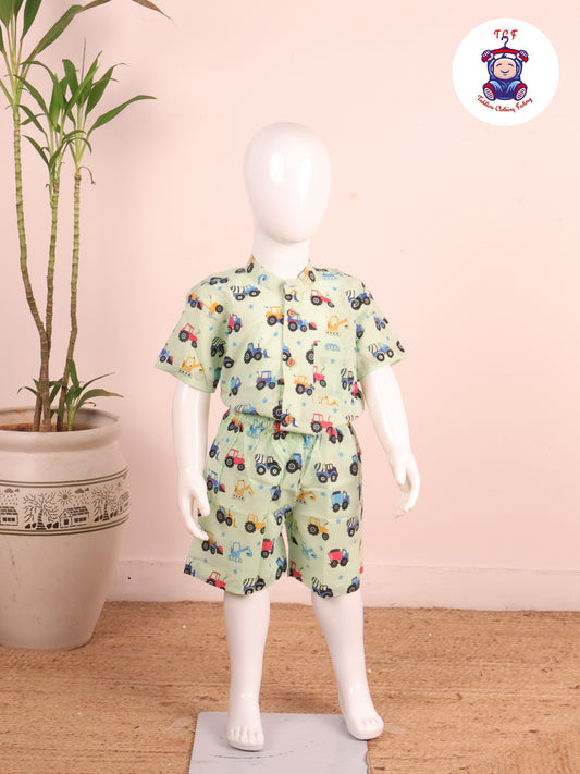Green - Printed Pan Collor Neck Shirt With Shorts