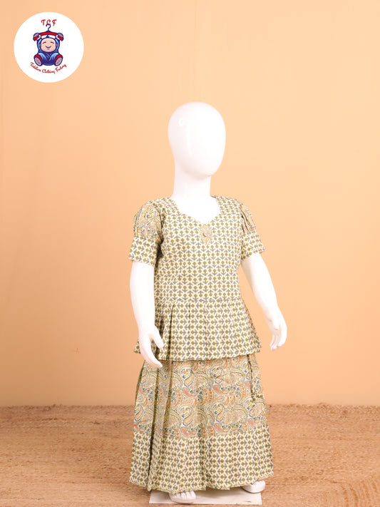 Brown & Green - Floral Printed Kalamkari Pavadai Sattai