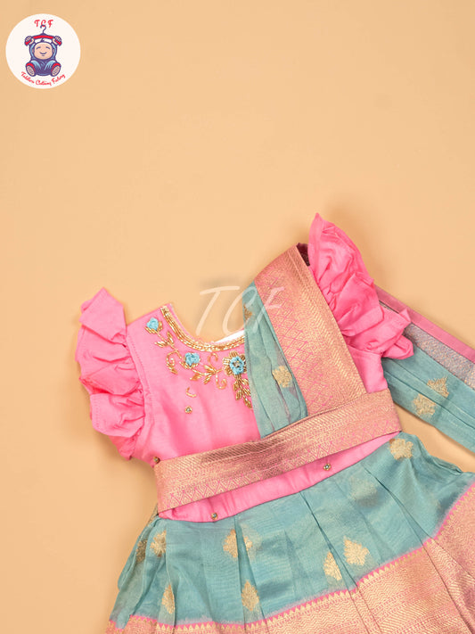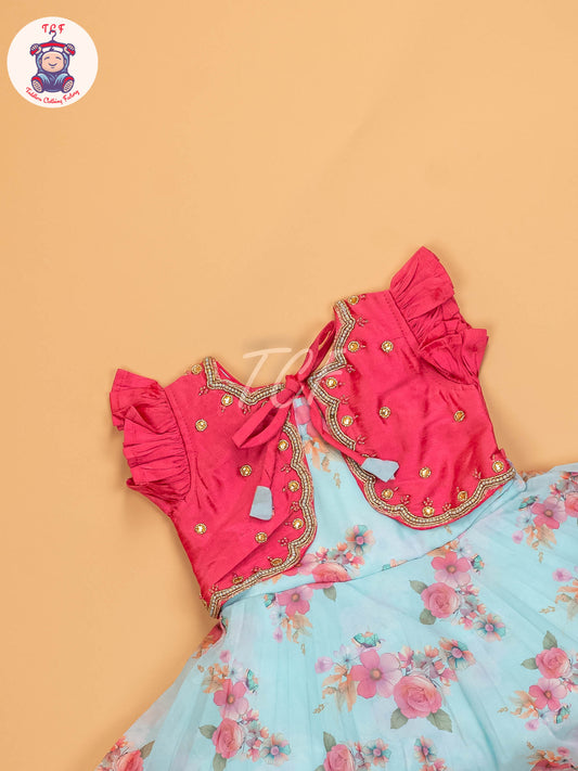 Pink & Sky Blue Floral - Kids Readymade Frocks