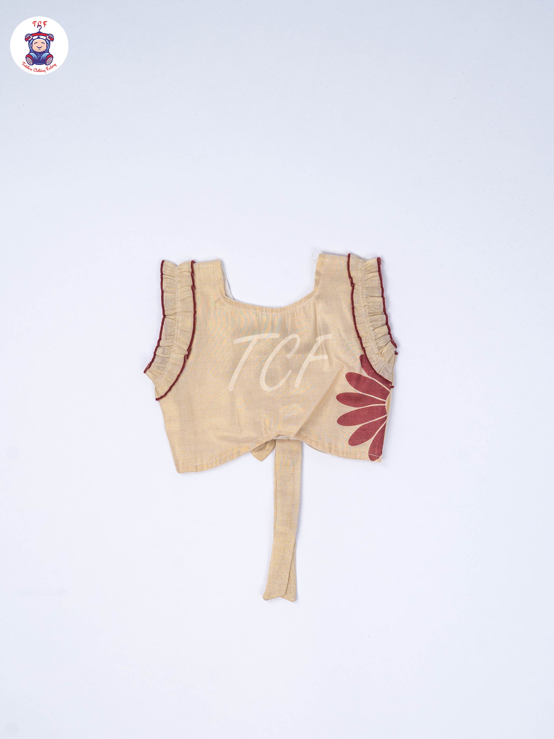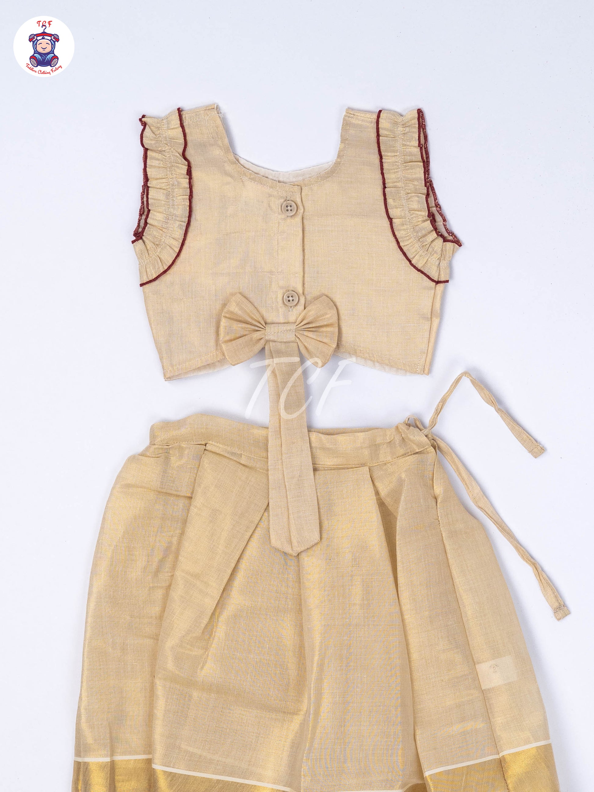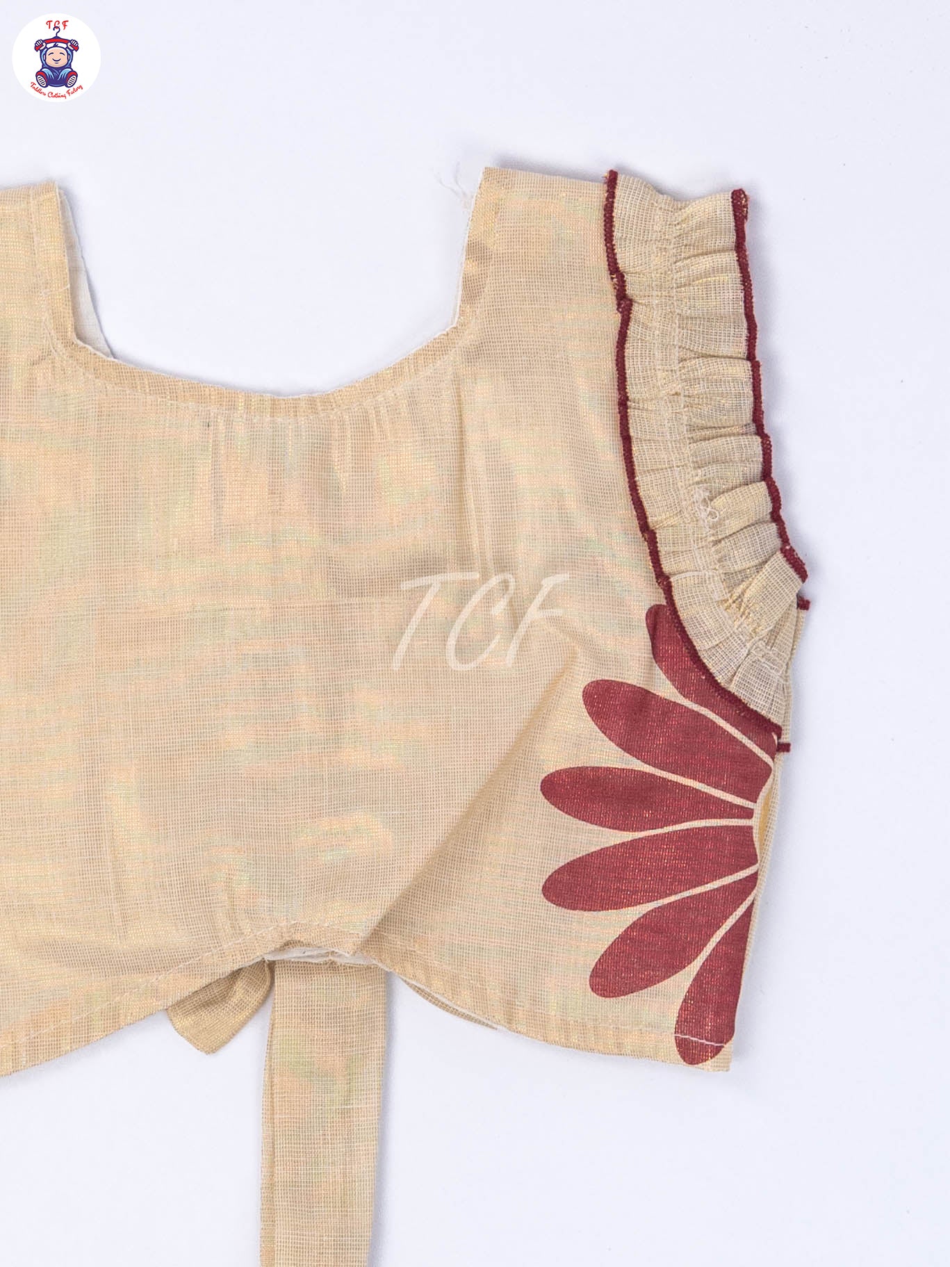 Kerala Cotton Pavadai Sattai is a traditional South Indian attire for young girls, beautifully crafted from soft and breathable Kerala cotton. Designed with classic white or off-white fabric and highlighted with golden zari borders, it reflects the elegance of Kerala’s cultural heritage.