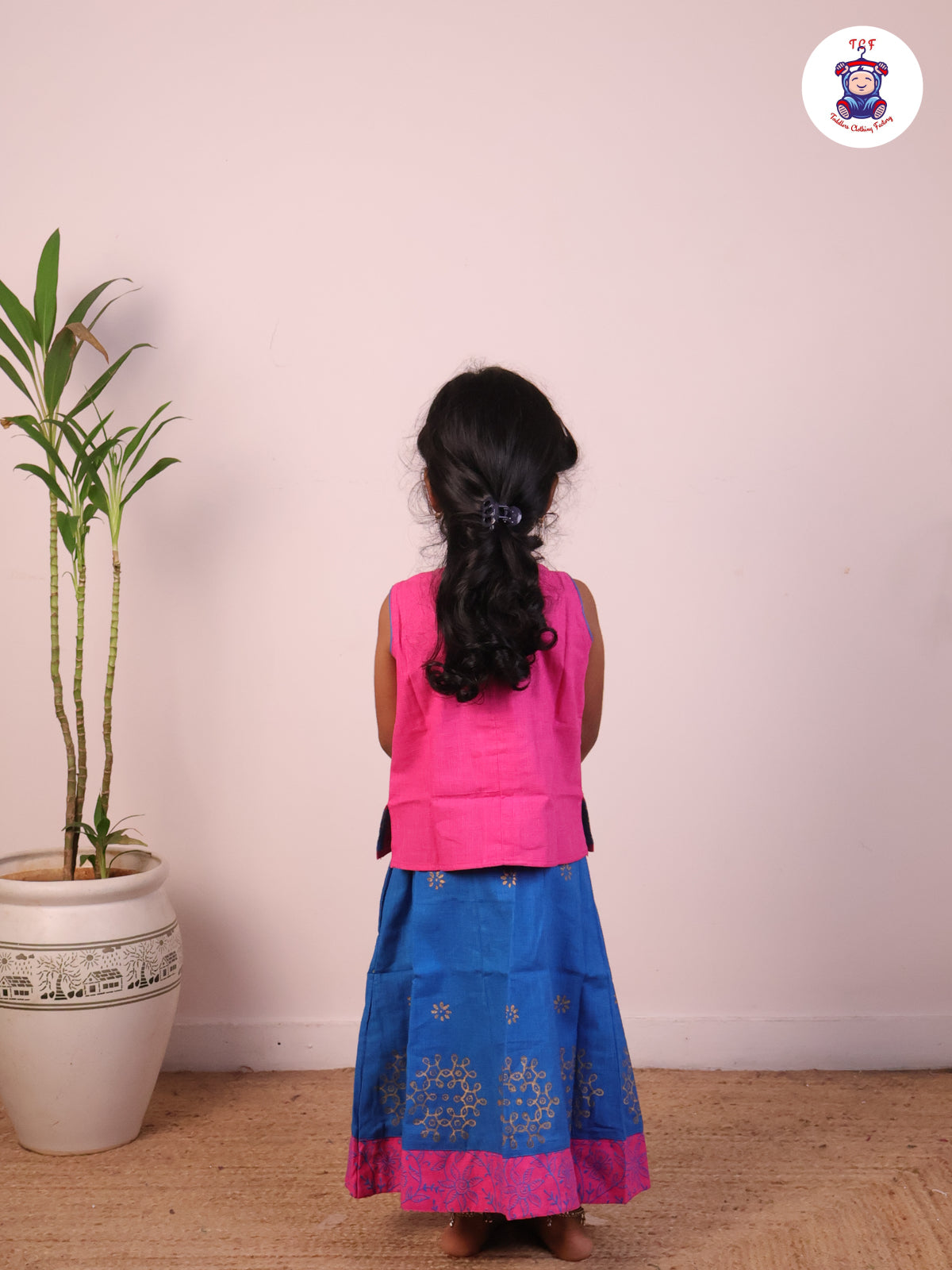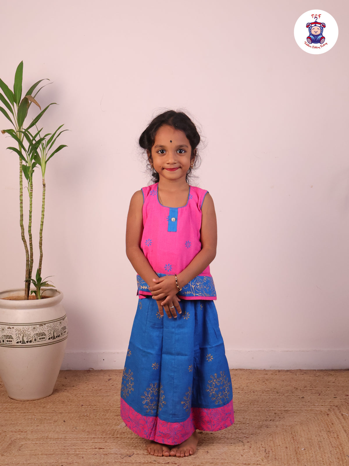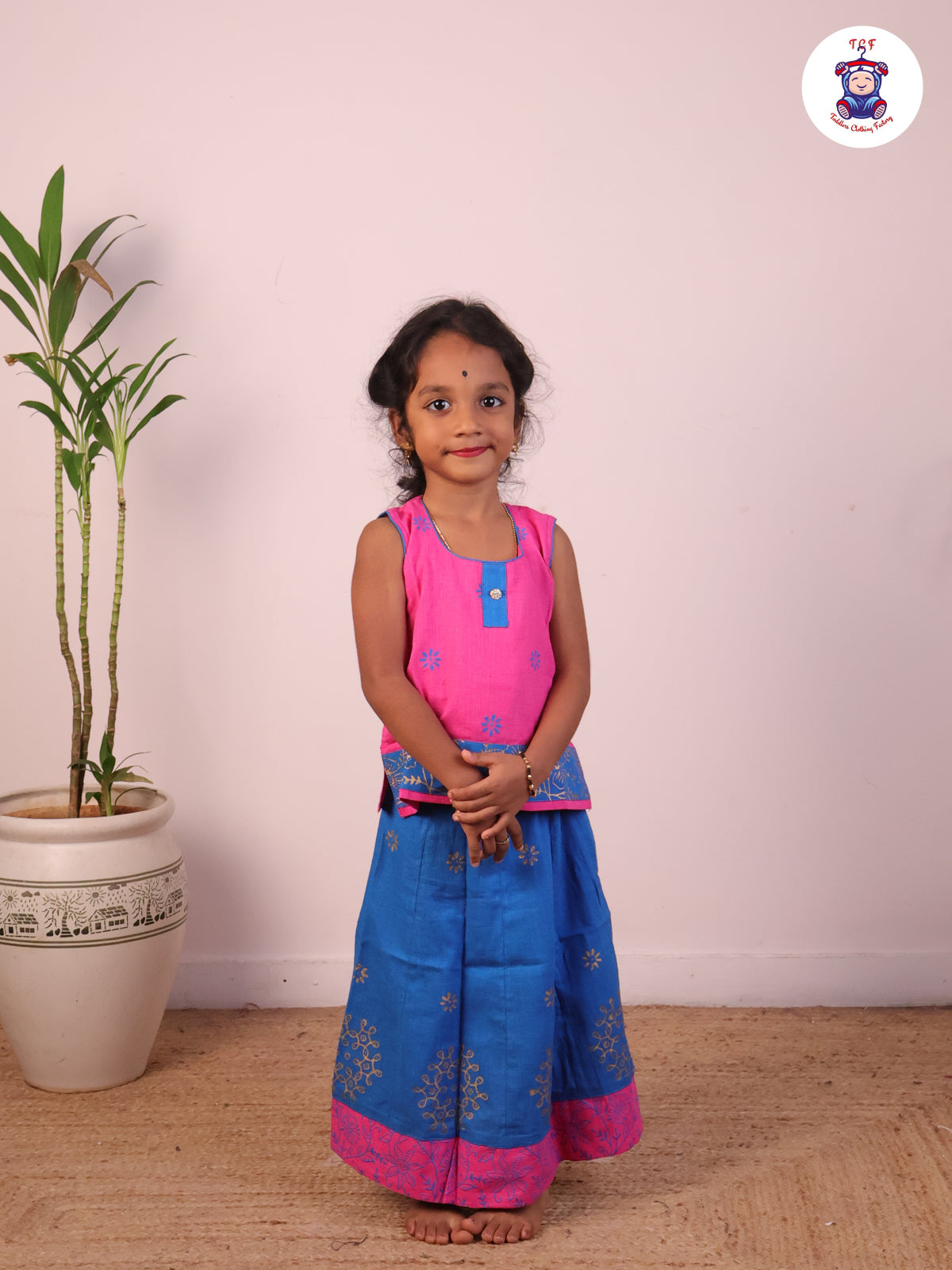 Classy Pink & Blue Printed readymade Pavadai set Made of premium quality fabric, it provides utmost comfort and lets your munchkin be in the best of their looks always!