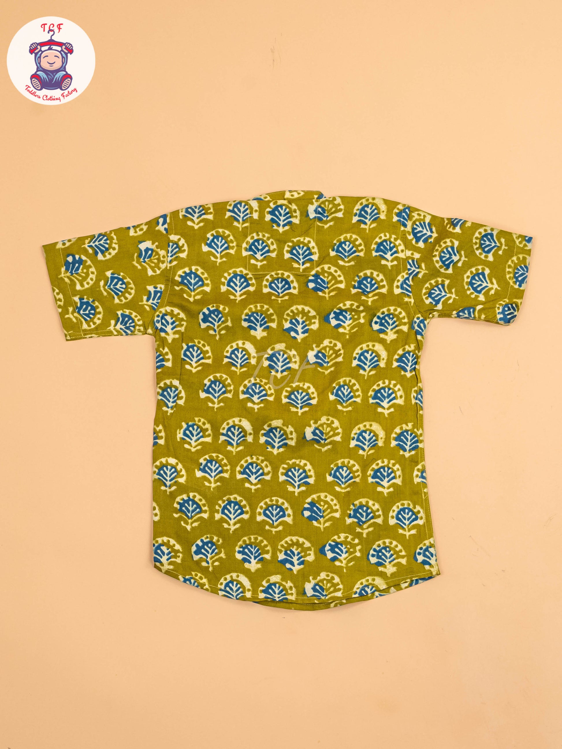Green - Printed Pan Collor Neck Shirt With Shorts