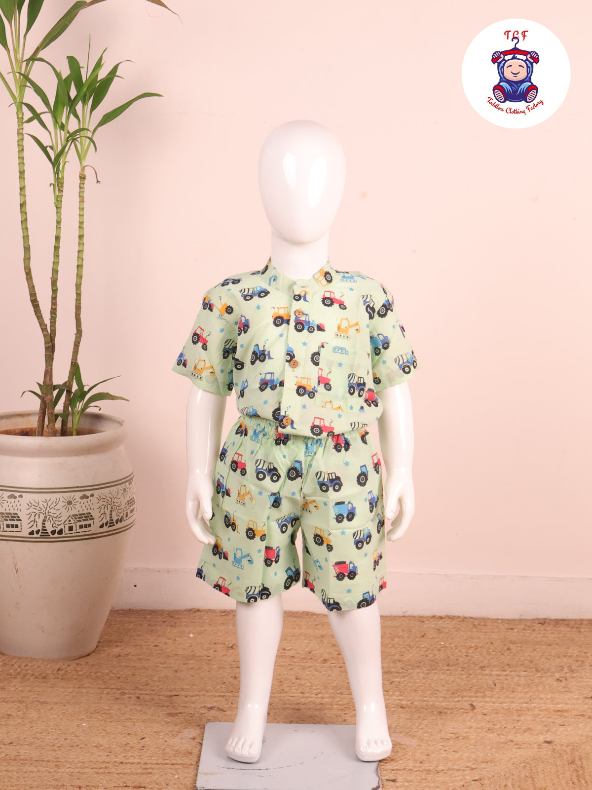 Green - Printed Pan Collor Neck Shirt With Shorts