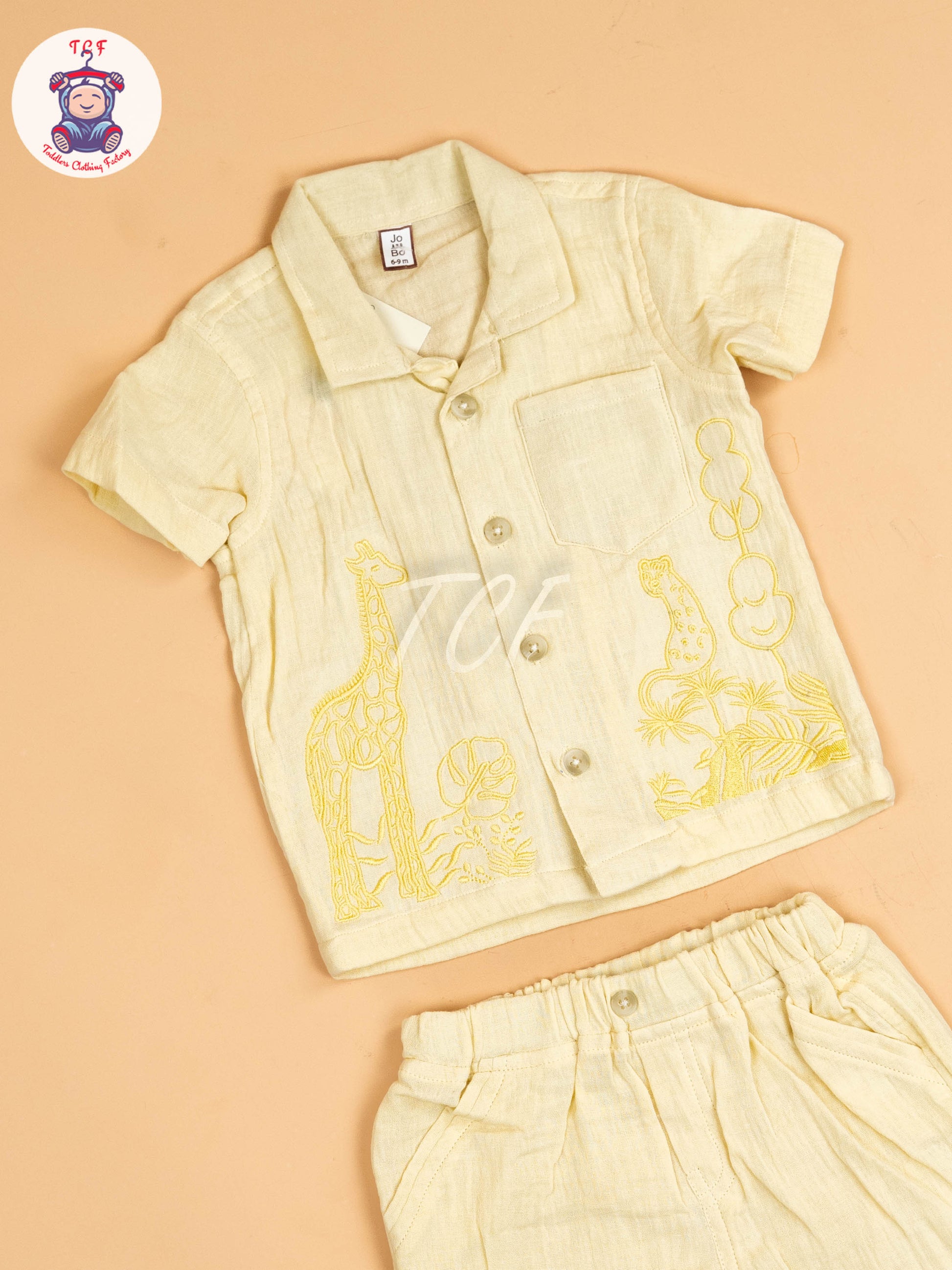 Green - Printed Pan Collor Neck Shirt With Shorts