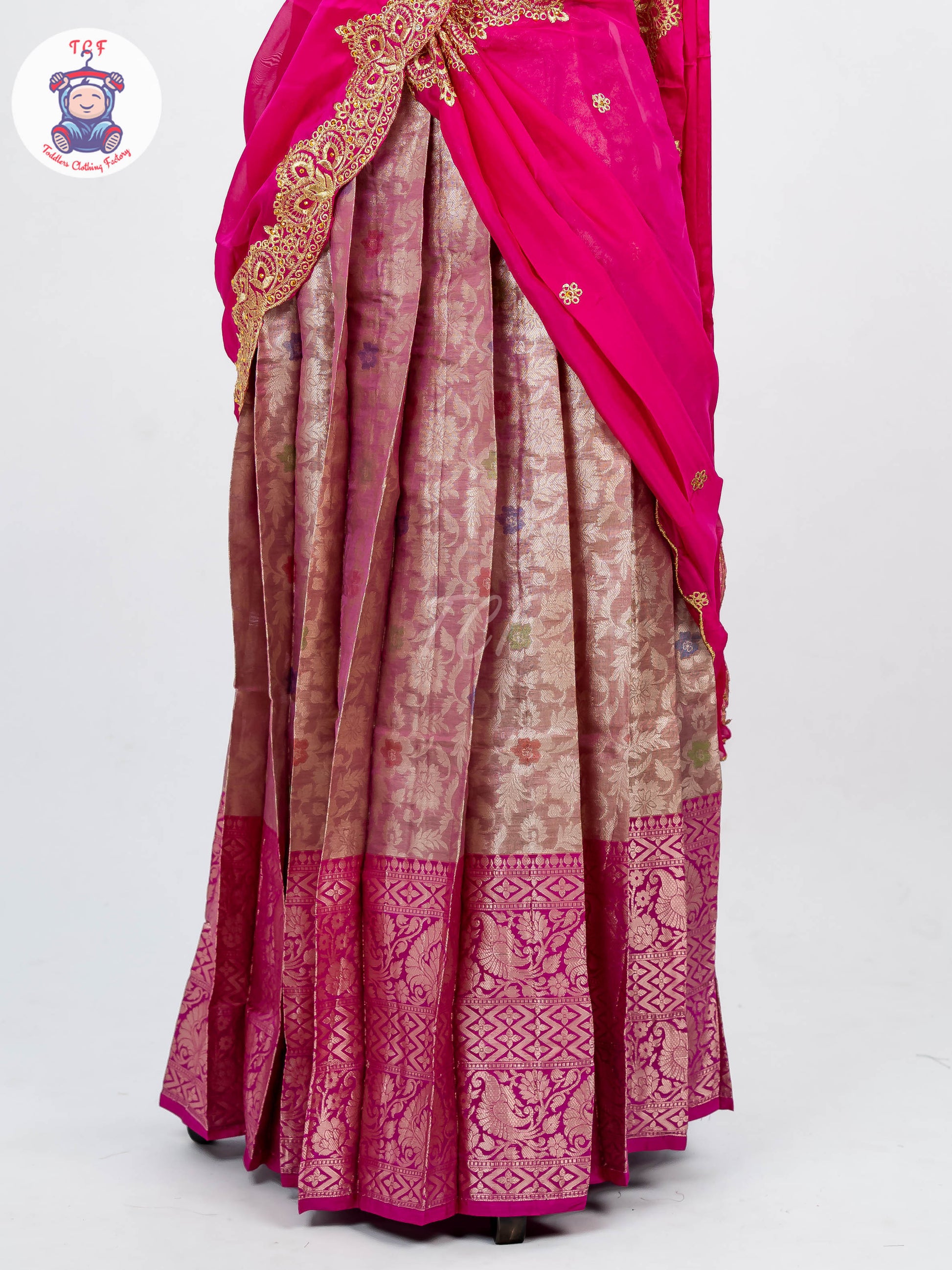 Girls Half Saree is a beautiful traditional South Indian outfit that blends cultural elegance with youthful charm. This three-piece ensemble consists of a flared skirt (pavadai or langa), a matching or contrasting blouse, and a graceful drape called voni or davani styled like a saree pallu. Crafted from rich fabrics such as silk, cotton silk, or brocade, and adorned with zari borders, embroidery, or traditional prints, the half saree offers a festive and elegant look while ensuring comfort. Perfect for festivals, weddings, cultural events, and special occasions, it symbolizes tradition, grace, and the joyful transition of young girls into adolescence.