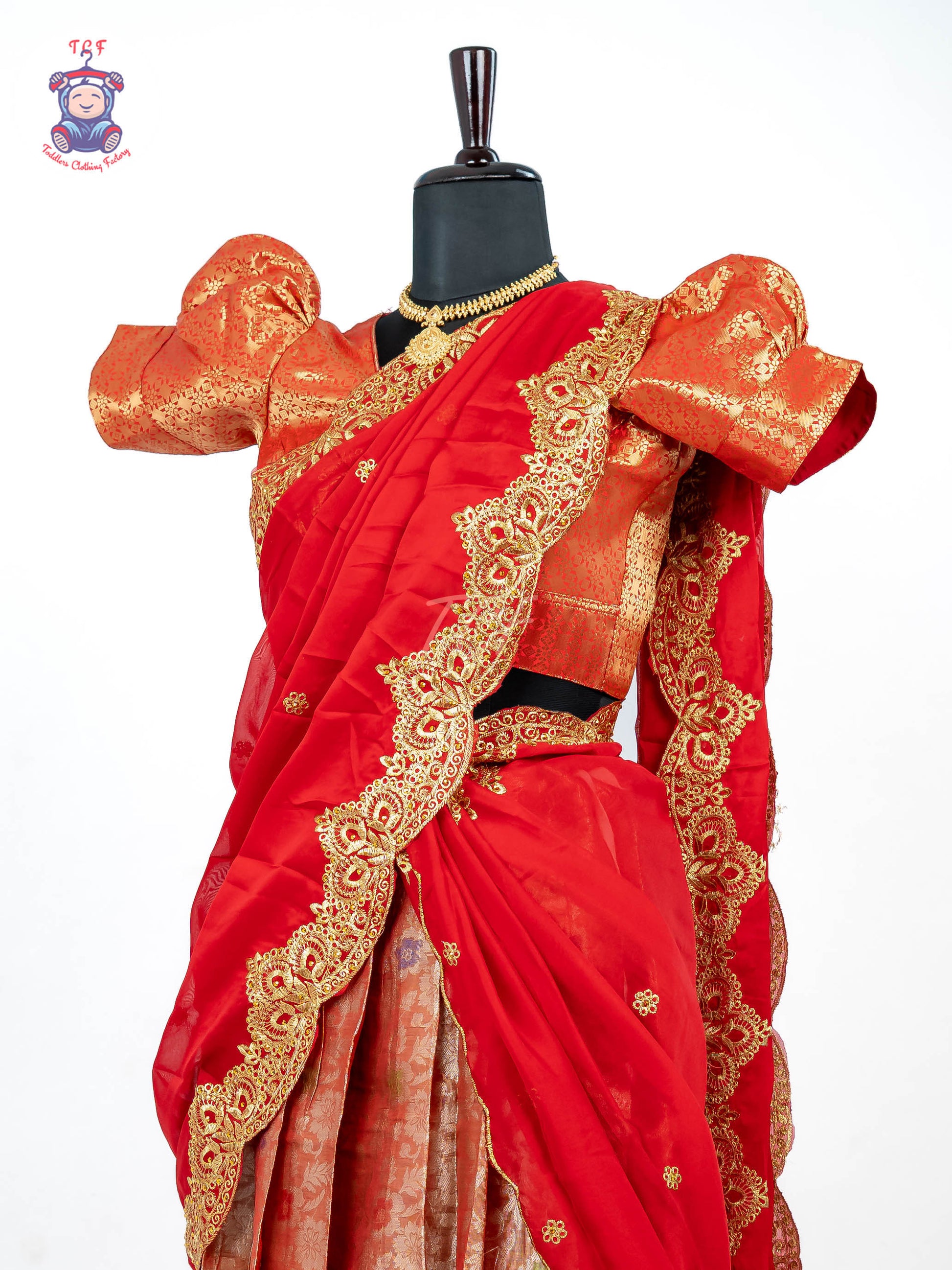 Girls Half Saree is a beautiful traditional South Indian outfit that blends cultural elegance with youthful charm. This three-piece ensemble consists of a flared skirt (pavadai or langa), a matching or contrasting blouse, and a graceful drape called voni or davani styled like a saree pallu. Crafted from rich fabrics such as silk, cotton silk, or brocade, and adorned with zari borders, embroidery, or traditional prints, the half saree offers a festive and elegant look while ensuring comfort. Perfect for festivals, weddings, cultural events, and special occasions, it symbolizes tradition, grace, and the joyful transition of young girls into adolescence.