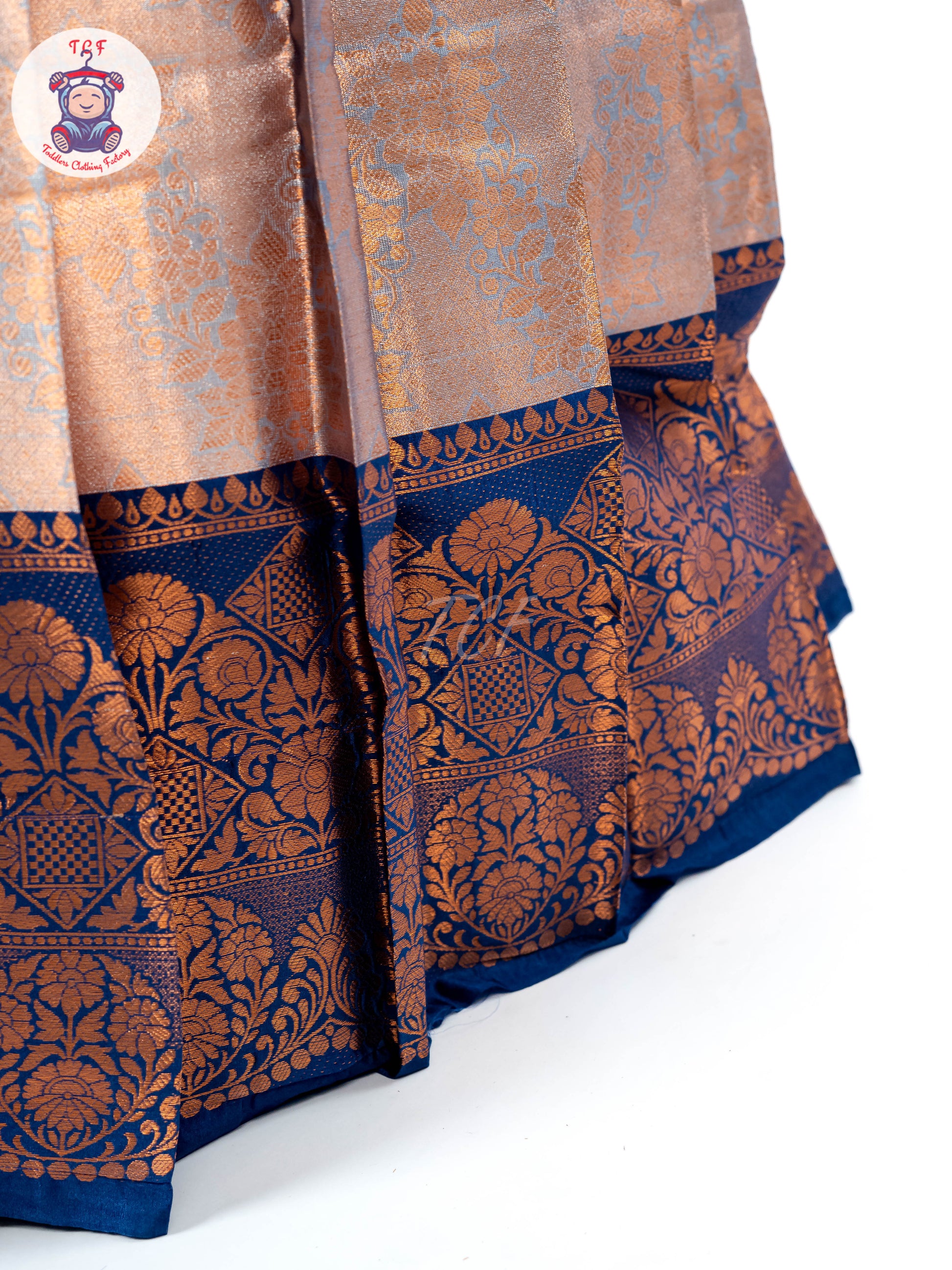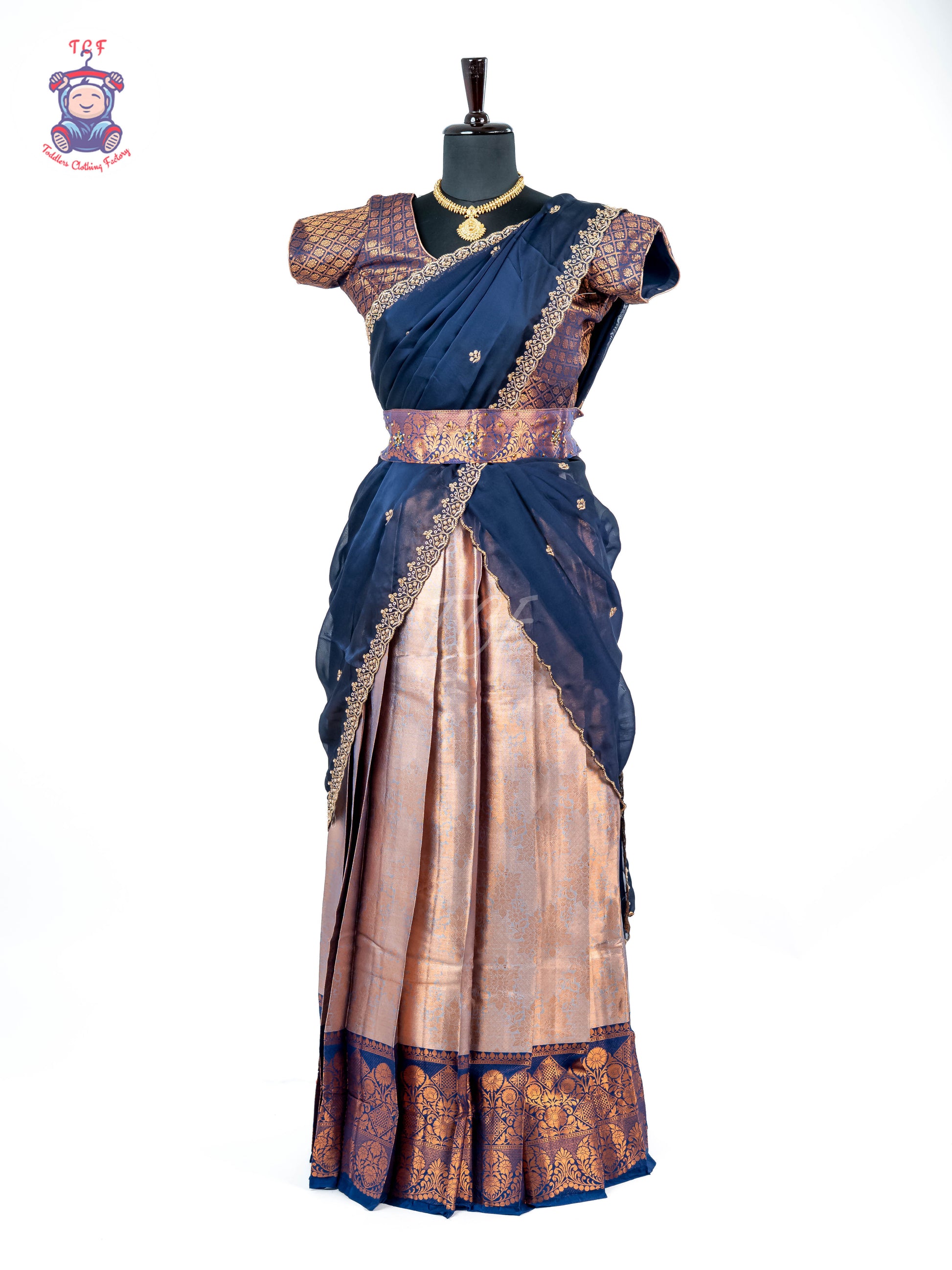 Girls Half Saree is a beautiful traditional South Indian outfit that blends cultural elegance with youthful charm. This three-piece ensemble consists of a flared skirt (pavadai or langa), a matching or contrasting blouse, and a graceful drape called voni or davani styled like a saree pallu. Crafted from rich fabrics such as silk, cotton silk, or brocade, and adorned with zari borders, embroidery, or traditional prints, the half saree offers a festive and elegant look while ensuring comfort. Perfect for festivals, weddings, cultural events, and special occasions, it symbolizes tradition, grace, and the joyful transition of young girls into adolescence.