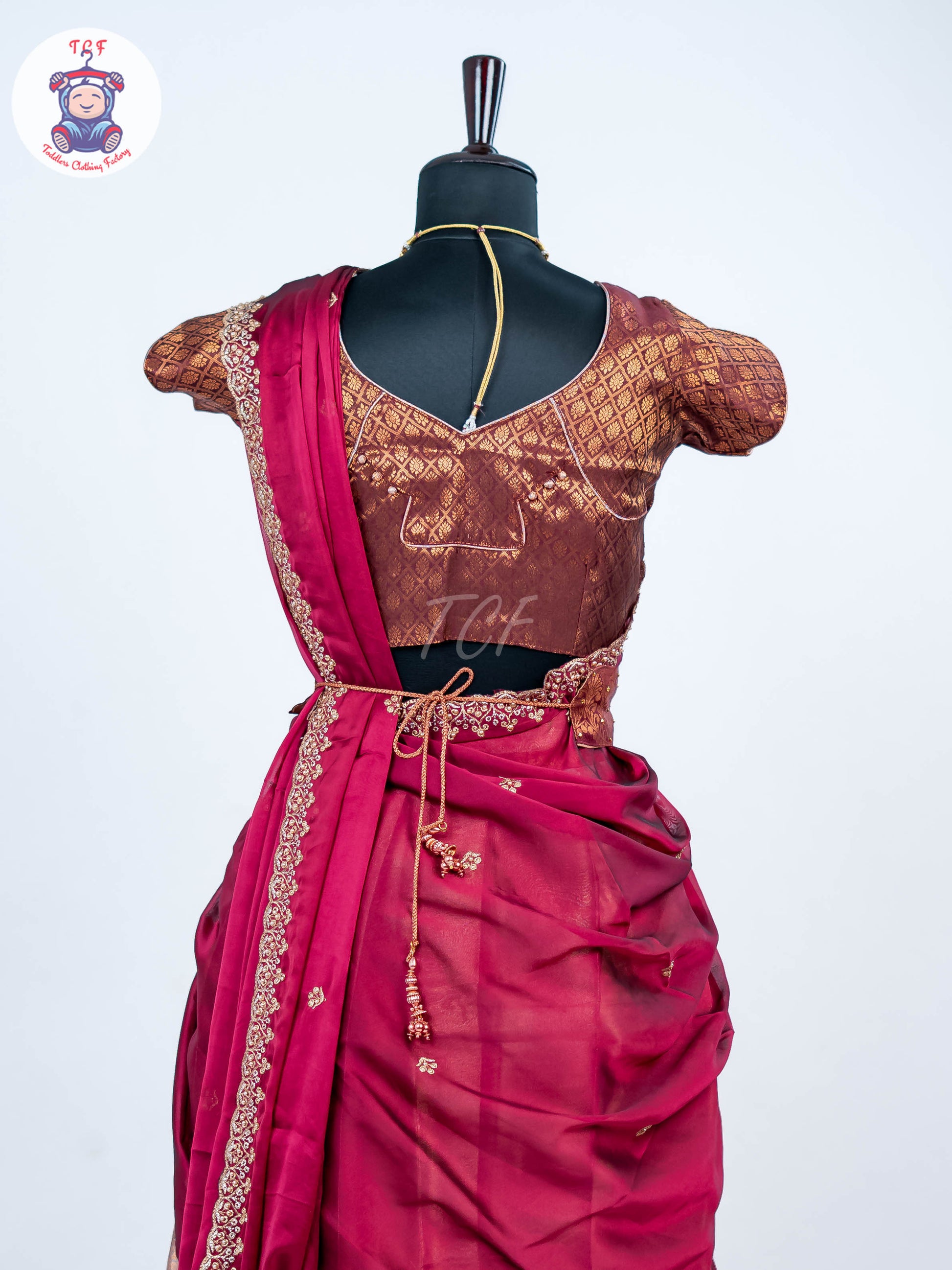 Girls Half Saree is a beautiful traditional South Indian outfit that blends cultural elegance with youthful charm. This three-piece ensemble consists of a flared skirt (pavadai or langa), a matching or contrasting blouse, and a graceful drape called voni or davani styled like a saree pallu. Crafted from rich fabrics such as silk, cotton silk, or brocade, and adorned with zari borders, embroidery, or traditional prints, the half saree offers a festive and elegant look while ensuring comfort. Perfect for festivals, weddings, cultural events, and special occasions, it symbolizes tradition, grace, and the joyful transition of young girls into adolescence.