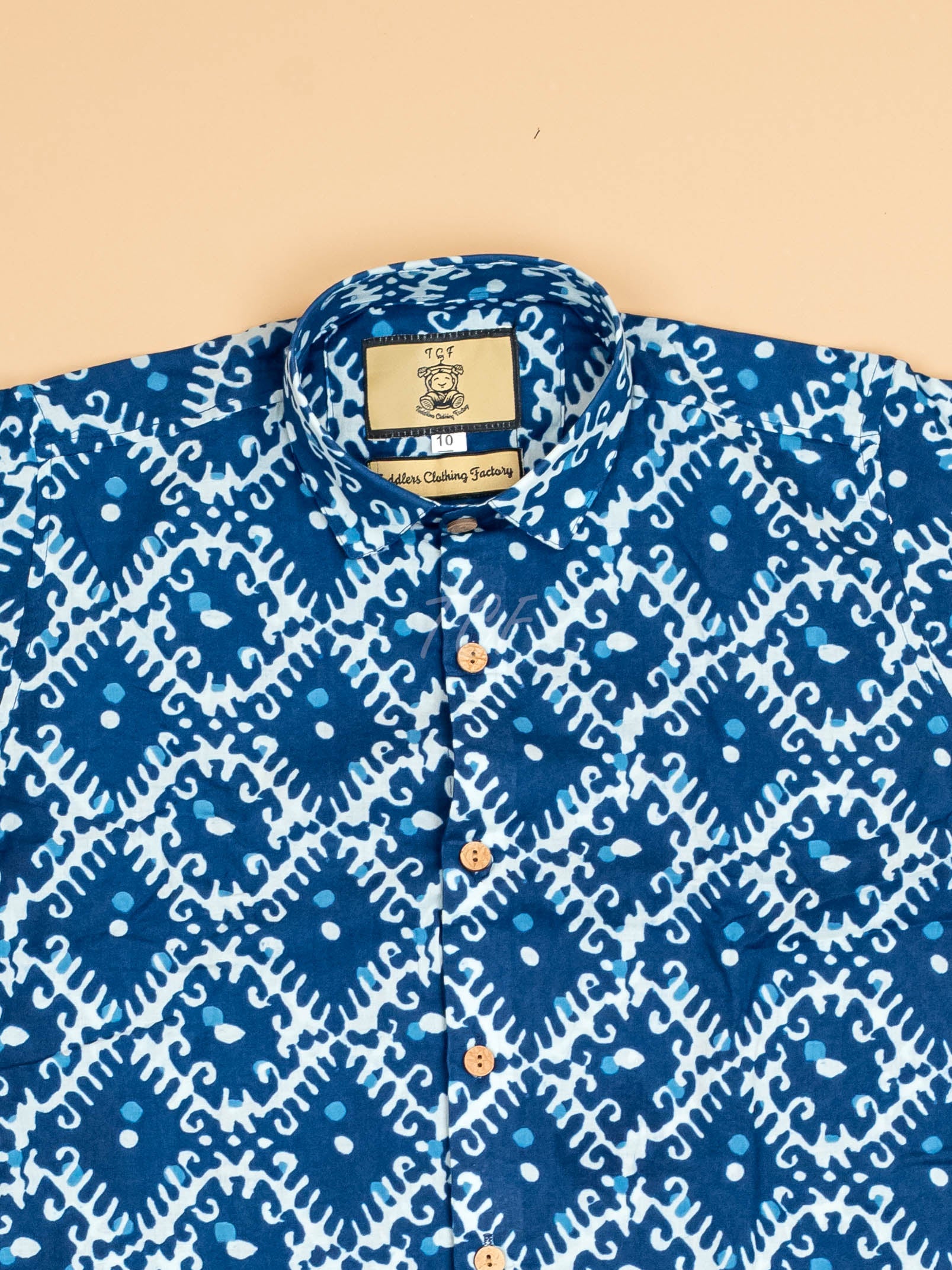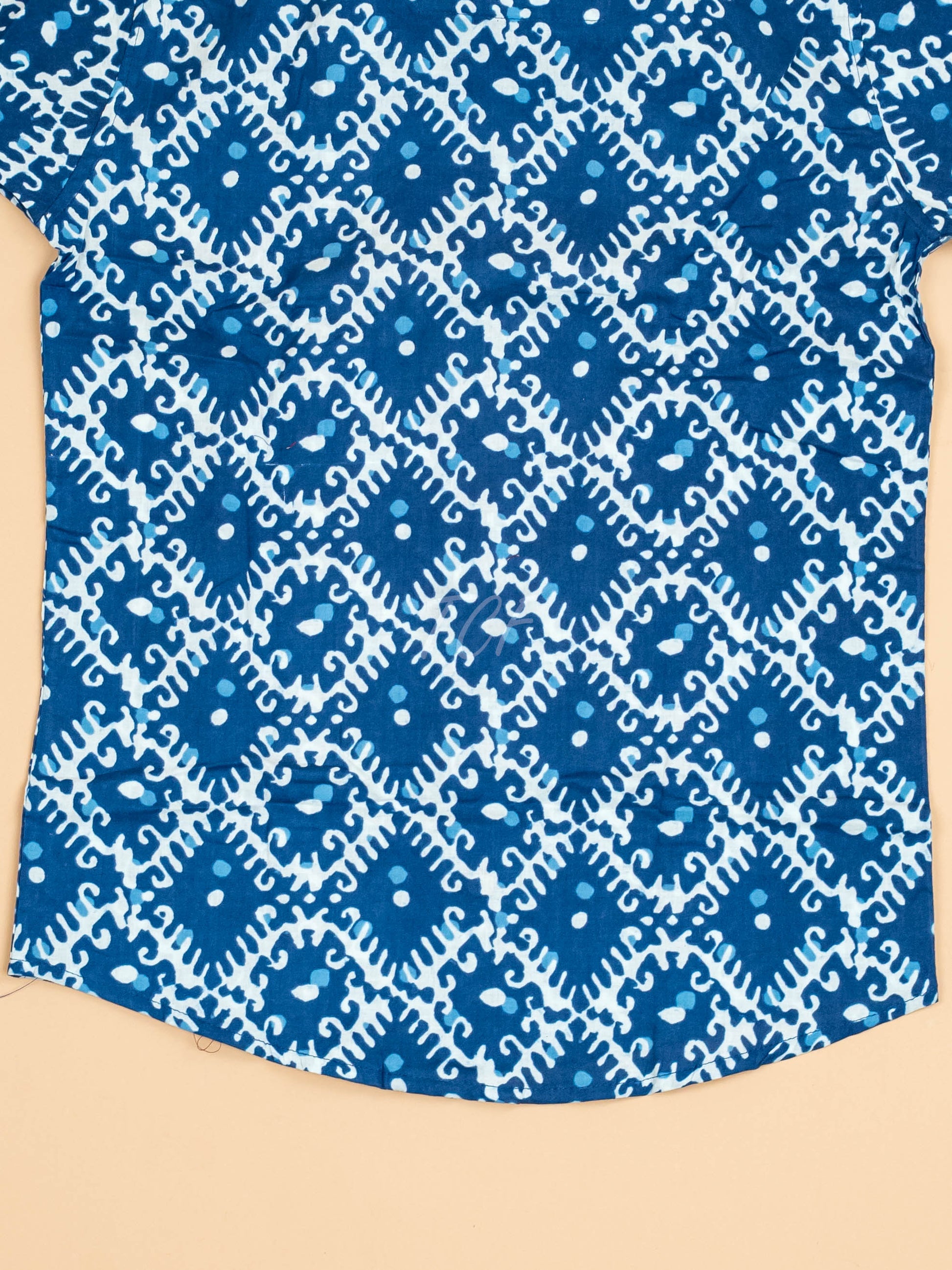 34shirt is a short-sleeved, collared button-down shirt featuring a striking design This fabric is covered in an all-over, repeating pattern of a stylized floral or geometric motif rendered in a contrasting deep blue. This pattern has the aesthetic of a traditional block-print. The shirt is finished with a classic collar and a row of small, light-colored buttons down the front placket.