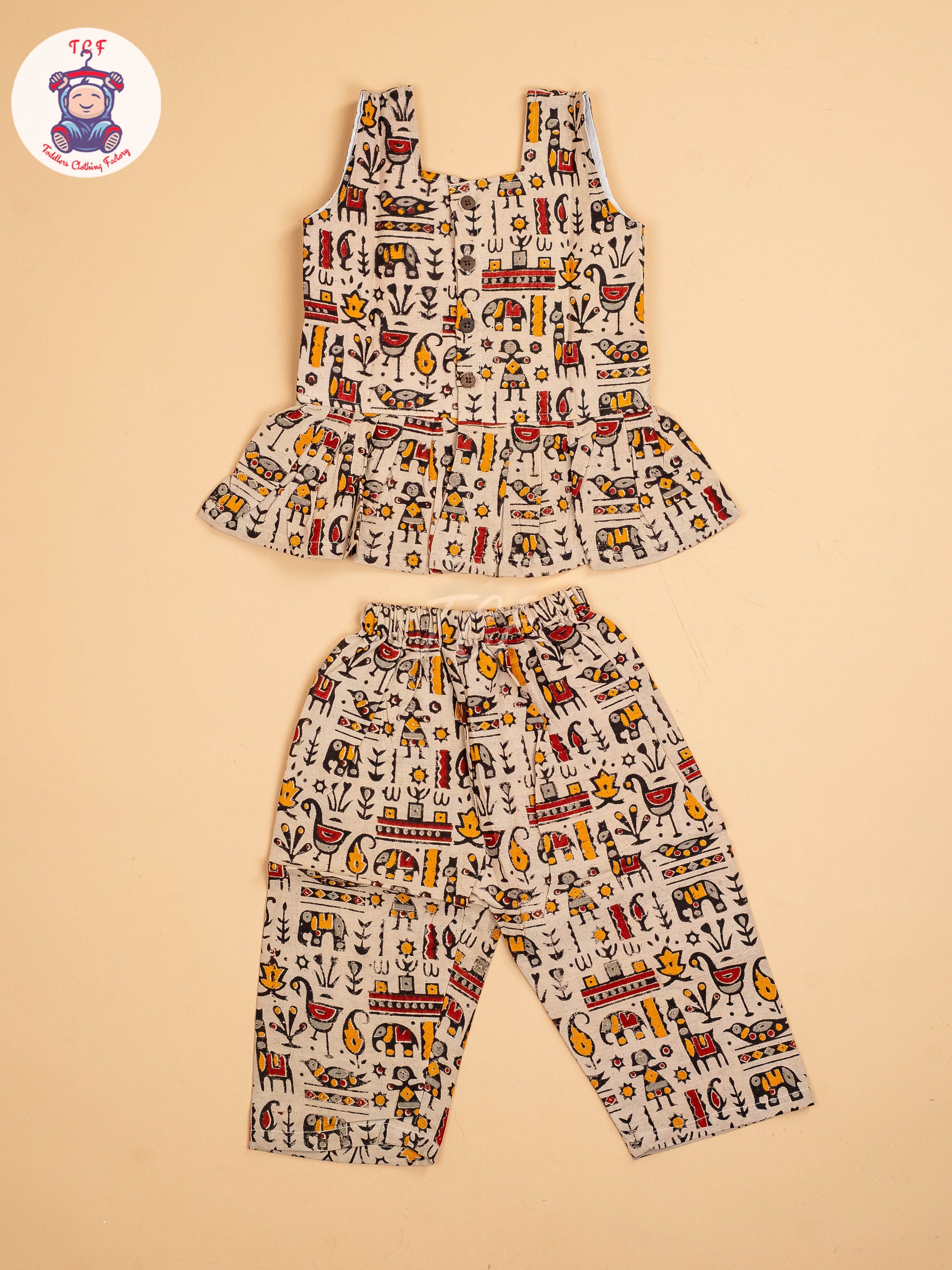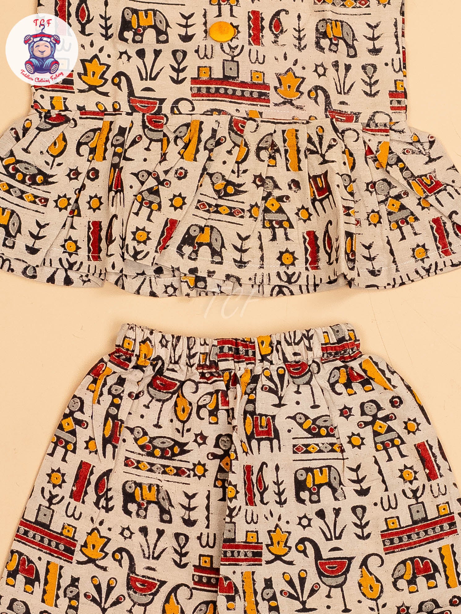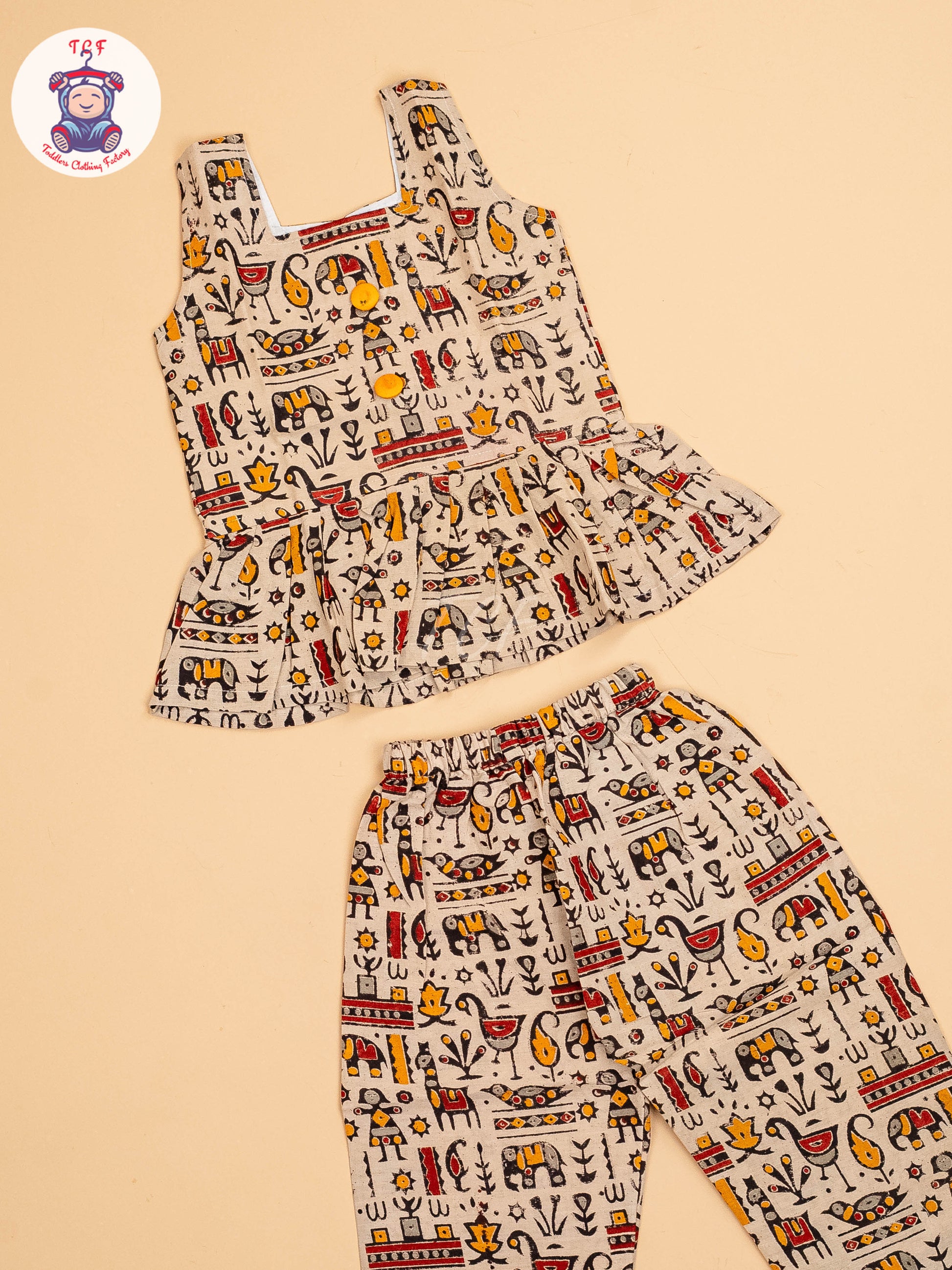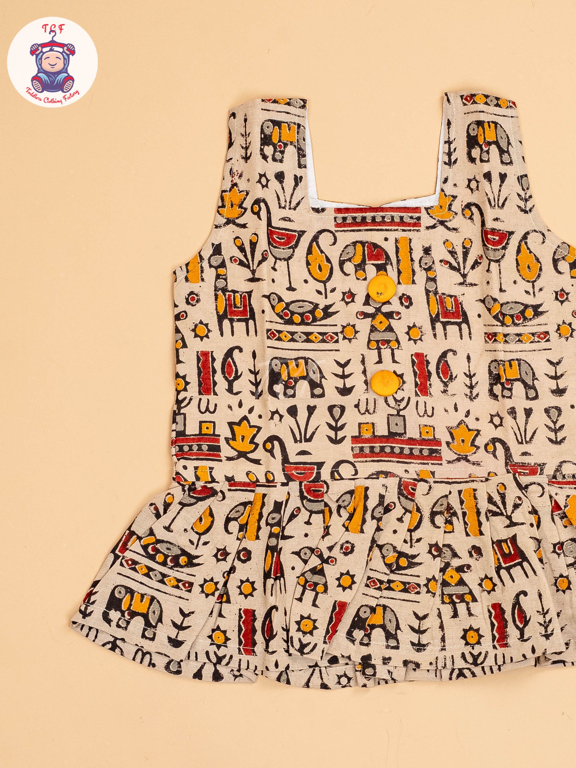 Dress your little one in ethnic elegance with this charming Kalamkari printed co-ord set. Crafted from soft, breathable cotton, this outfit features a sleeveless top with wooden button detailing and a comfortable pair of matching pants. The vibrant blue base adorned with traditional Kalamkari motifs gives it a rich, artistic appeal.