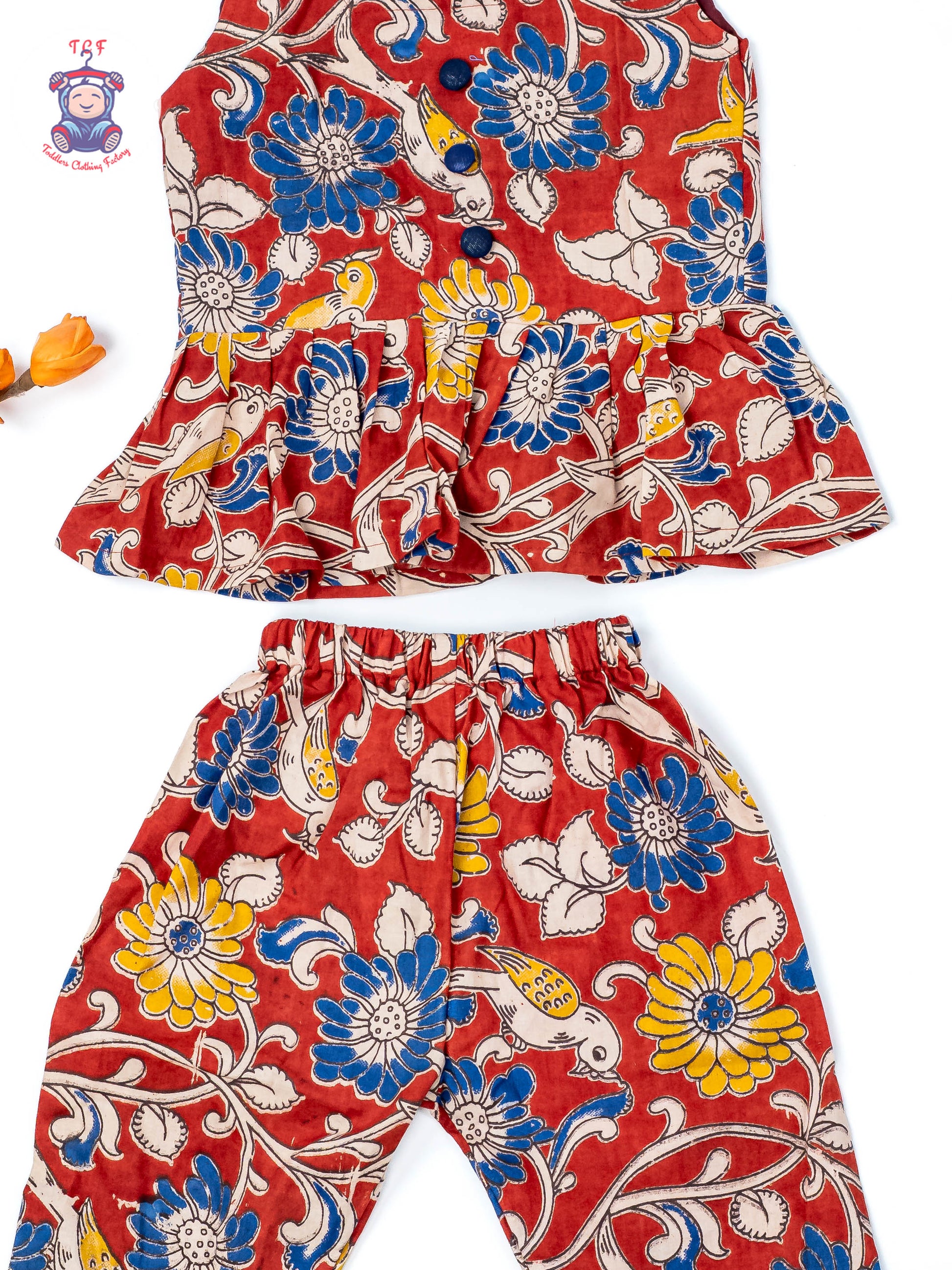 Dress your little one in ethnic elegance with this charming Kalamkari printed co-ord set. Crafted from soft, breathable cotton, this outfit features a sleeveless top with wooden button detailing and a comfortable pair of matching pants. The vibrant blue base adorned with traditional Kalamkari motifs gives it a rich, artistic appeal.