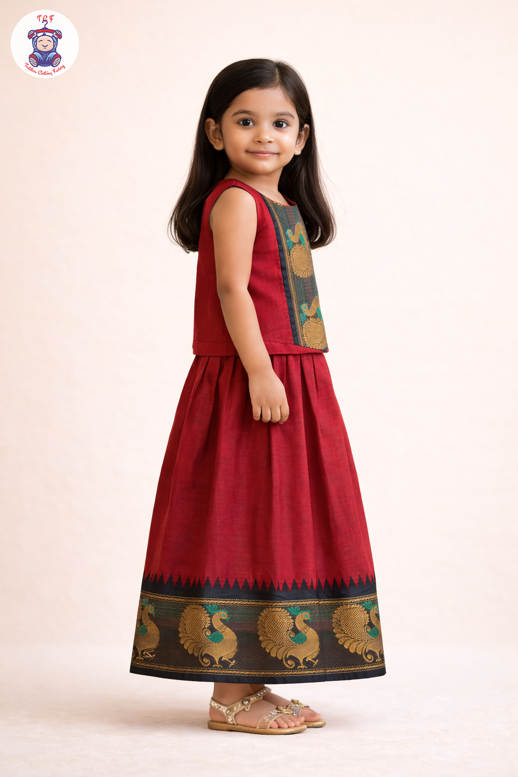 Adorn your little girl in traditional elegance with our Chettinad Cotton Pavadai Sattai, beautifully crafted from authentic Chettinad handloom cotton. This outfit features a vibrant pavadai (skirt) paired with a matching sattai (blouse) showcasing classic South Indian patterns and rich colors.