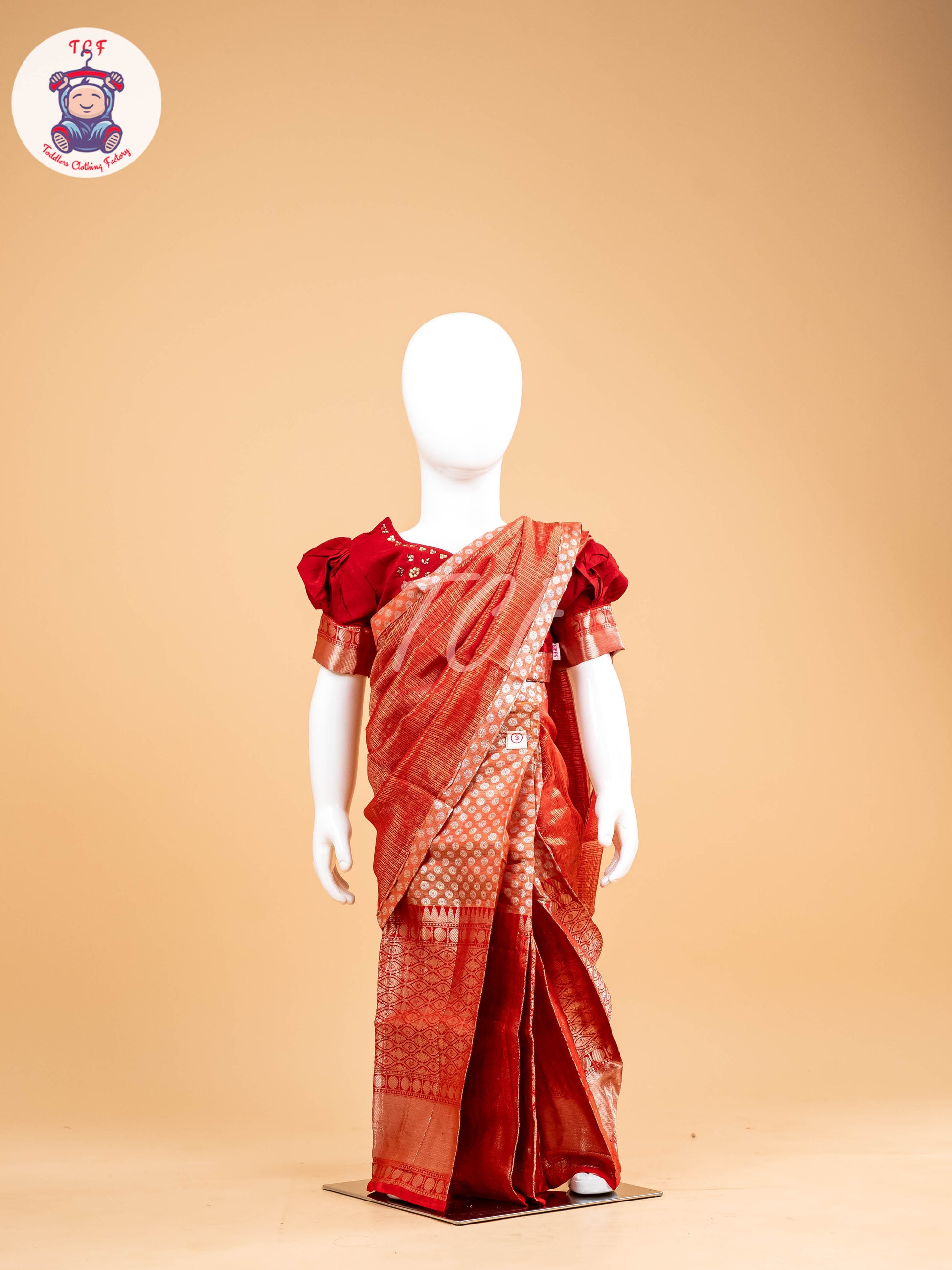 The Velcro Saree for Kids is a ready-to-wear, pre-stitched saree designed especially for young girls (ages ~2–12). Rather than complex draping and pins, this style uses Velcro strips to secure the pallu (the free drape) and the pleats, making it safe, quick, and comfortable to wear.